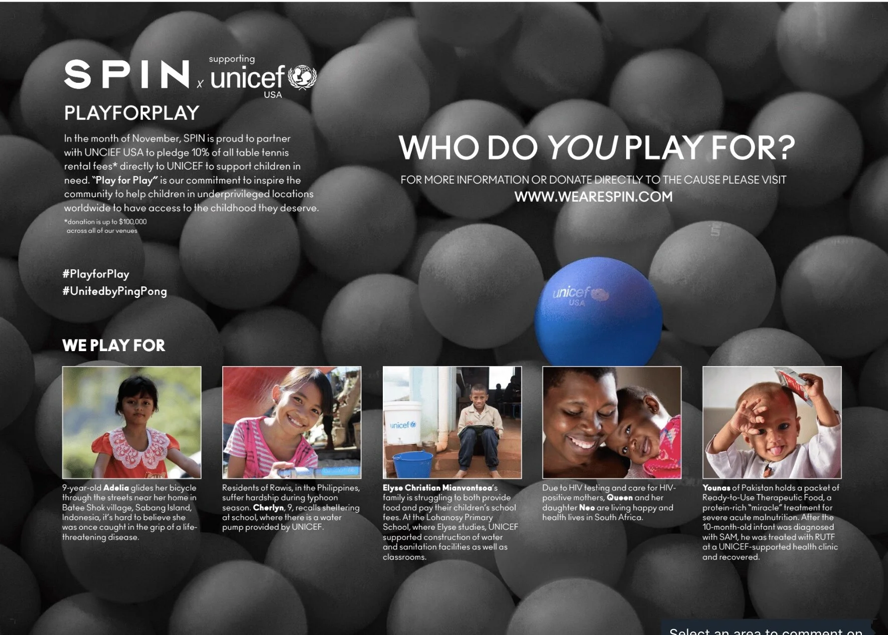 It all began when SPIN decided to partner with UNICEF to launch #PlayforPlay campaign, designated to allow the ping pong consumers to play and a portion of their table fees would go directly to UNICEF, where they would use the funds to allow for refugees and children in need to play.